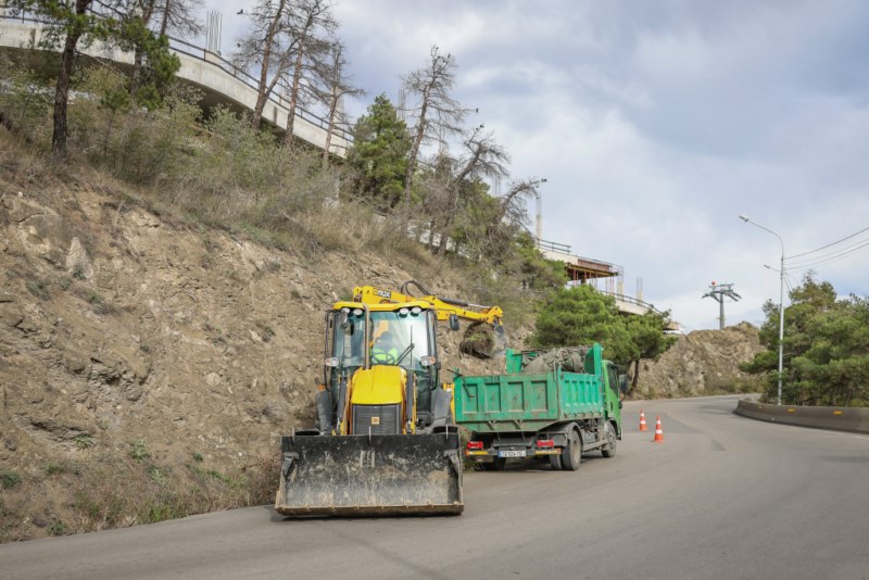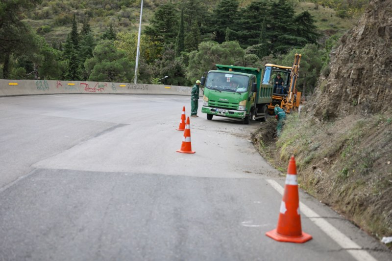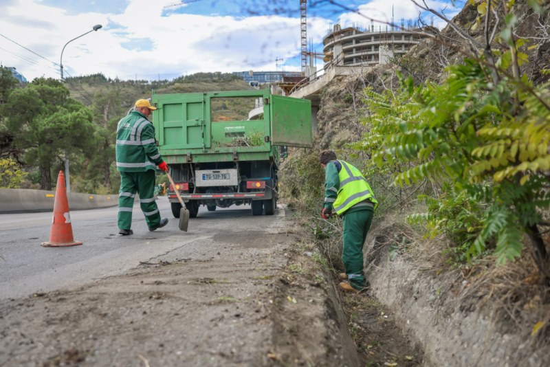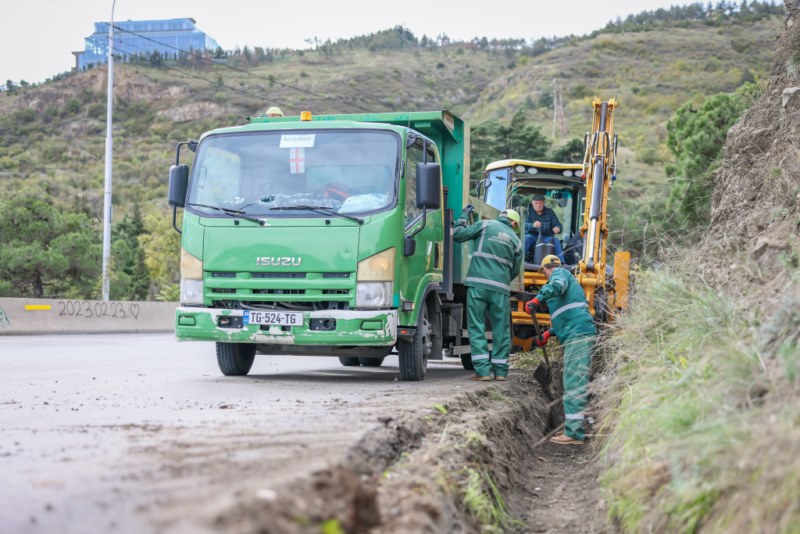 Along the Tbilisi-Okrokana road, more precisely on the ascent of Maro Makashvili, a comprehensive cleaning of the drainage network is currently underway.